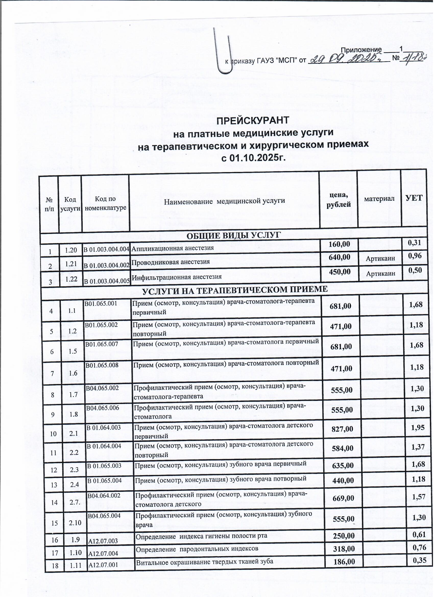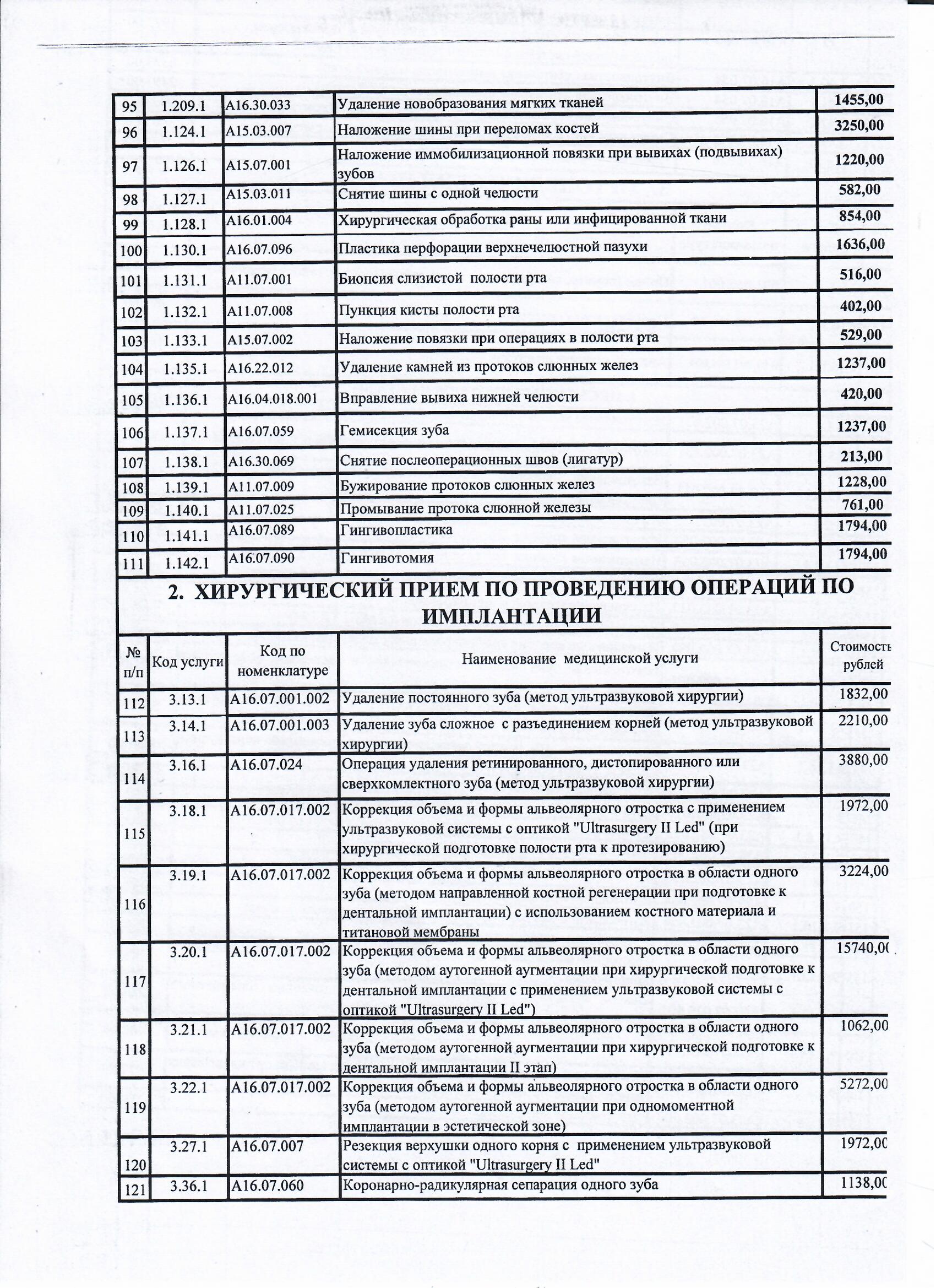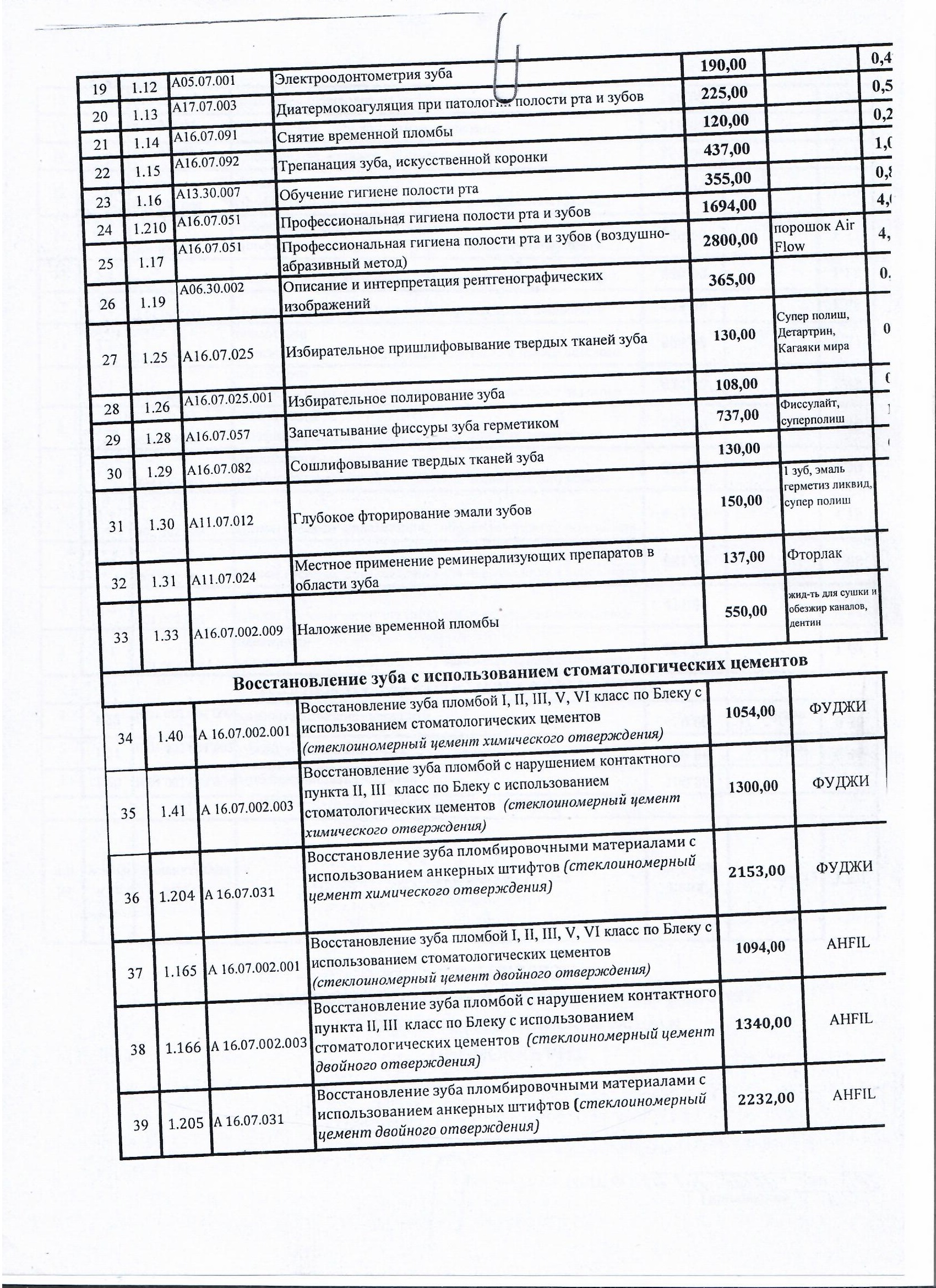 Прейскурант цен на платные услуги