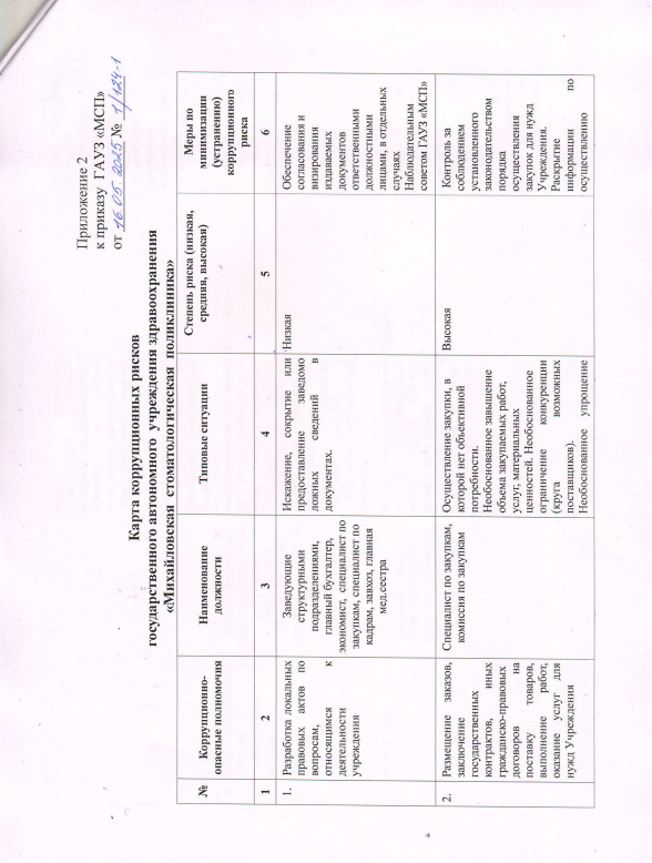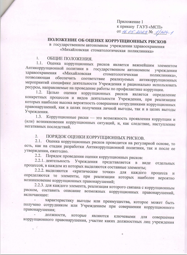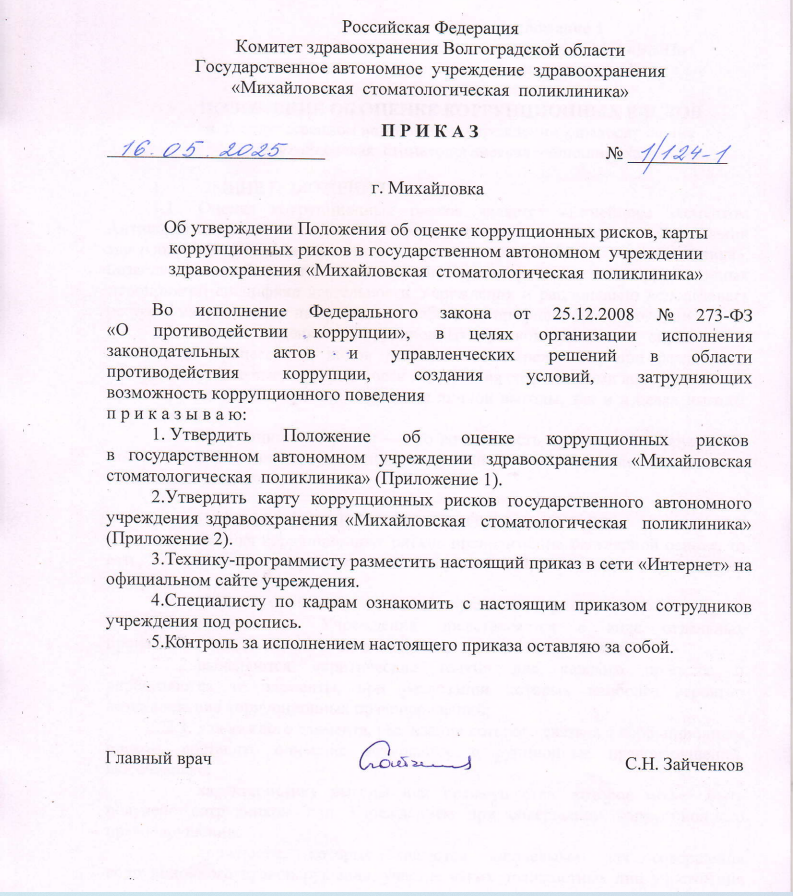 Приказ №1/124-1 от 16.05.2025 Об утверждении Положения об оценке коррупционных рисков, карты коррупционных рисков в государственном автономном учреждении здравоохранения "Михайловская стоматологическая поликлиника"